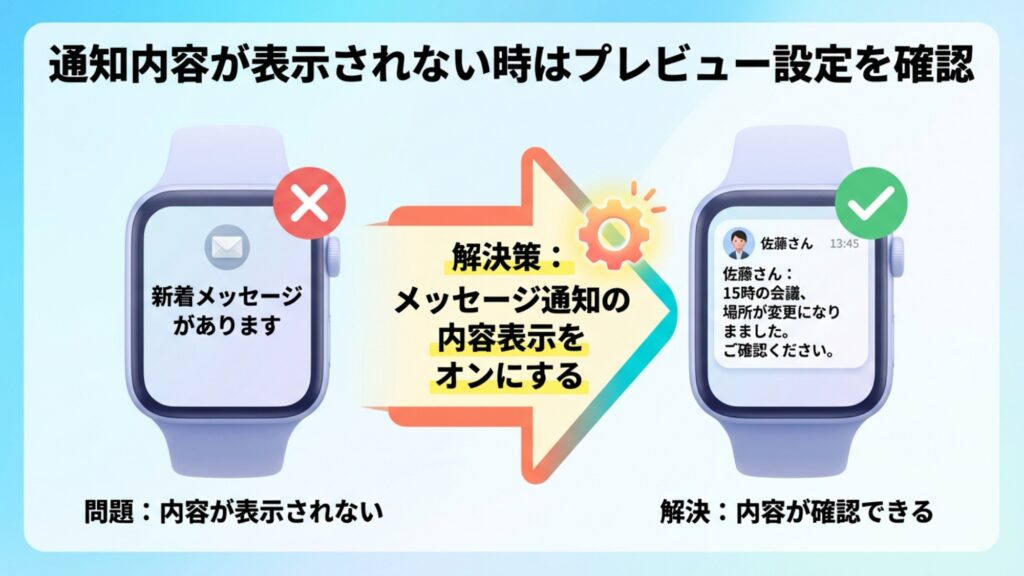 さらに、スマホ本体の通知設定における「プレビュー表示」の設定も連動しています。スマホのロック画面でメッセージ内容を隠す設定にしていると、ウォッチ側でも隠されてしまうことがあります。便利さとプライバシーのバランスを考えながら設定を見直してみてください。
