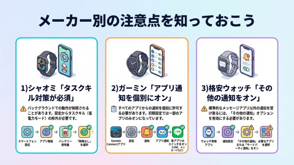 スマートウォッチはメーカーによって管理アプリの作りが全く違います。ここでは、特にユーザー数が多く、かつ設定にクセがあるメーカーごとの攻略法を表にまとめました。