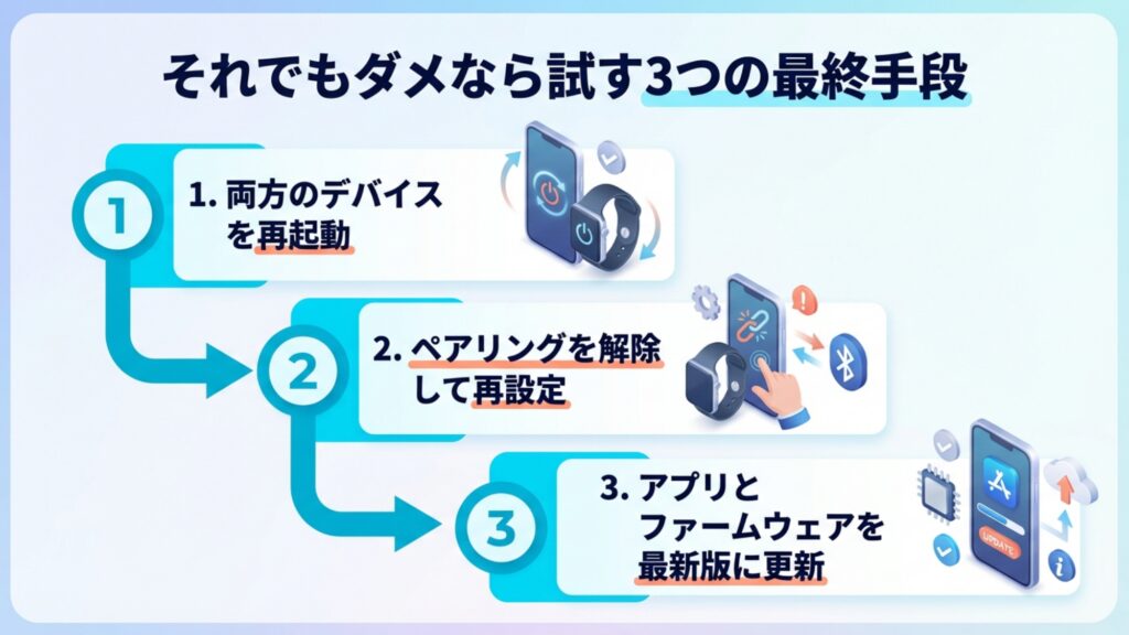 手順としては、まず「スマートウォッチ」と「スマートフォン」の両方の電源を切り、再起動してください。片方だけでなく両方やることが重要です。再起動することで、メモリ内に溜まったゴミデータがクリアされ、詰まっていた通信がスムーズになります。